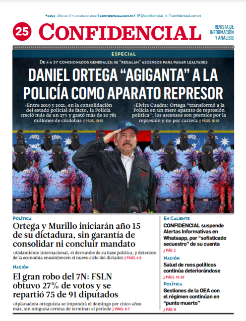 De 2007 a 2020, la Policía Nacional pasó de 9290 a 16 909 integrantes, según datos publicados en sus anuarios estadísticos, analizados por CONFIDENCIAL. El crecimiento exponencial de la Policía ha sido más evidente tras la masacre contra el estallido social de 2018. Entre 2019 y 2021, el crecimiento de la entidad es de un…