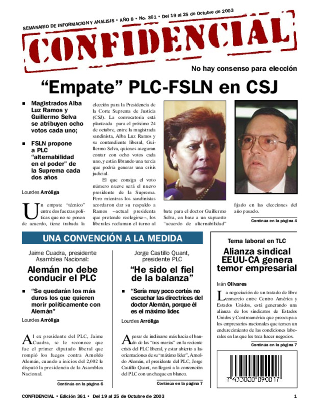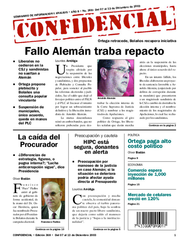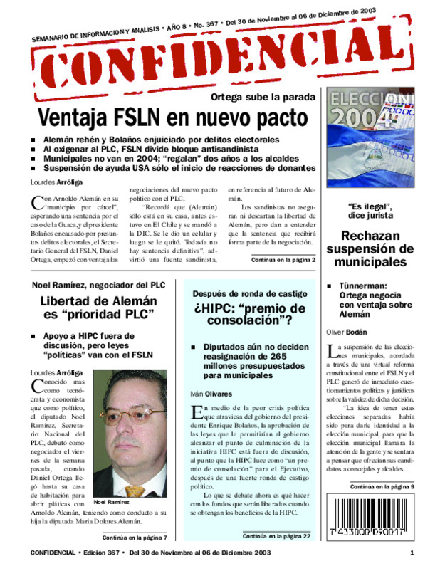 Alemán rehén y Bolaños enjuiciado por delitos electorales. Al oxigenar al PLC, FSLN divide bloque antisandinista. Municipales no van en 2004; «regalan» dos años a los alcaldes.