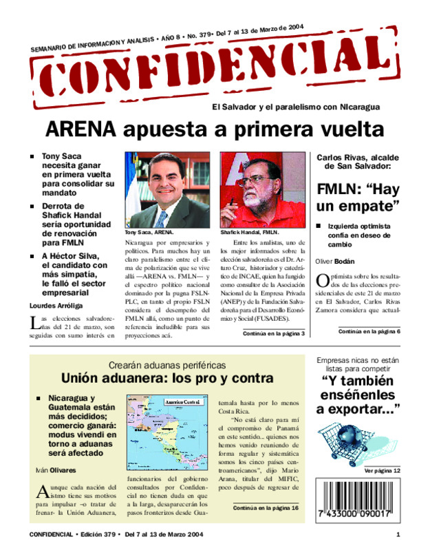 El Salvador y el paralelismo con NIcaragua: Tony Saca necesita ganar en primera vuelta para consolidar su mandato. Derrota de Shafick Handal sería oportunidad de renovación para FMLN.