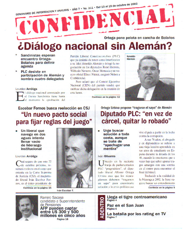 Sandinistas esperan encuentro Ortega-Bolaños para definir agenda. PLC desiste en participación de Alemán y nombra cuatro delegados.