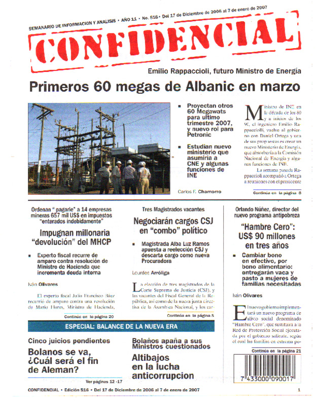 Proyectan otros 60 Megawats para ultimo trimestre 2007, y nuevo rol para Petronic. Estudian nuevo ministerio que asumiría a CNE y algunas funciones de INE.